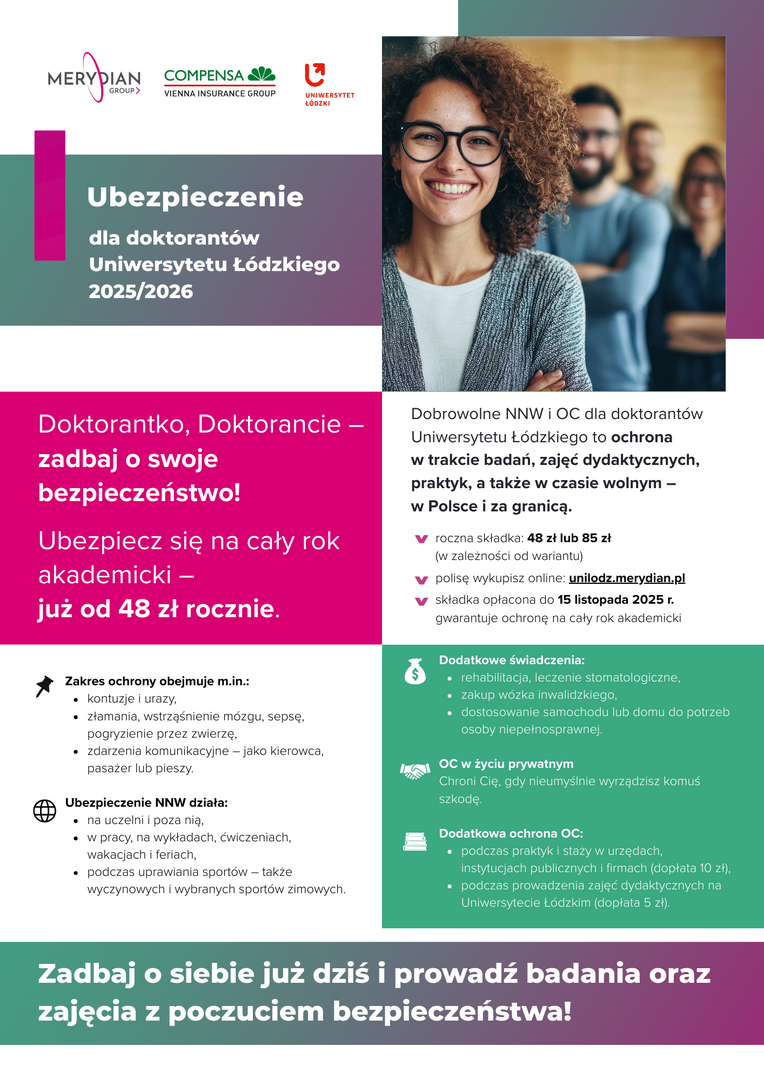 Roczna składka ubezpieczenia w tym zakresie na rok akademicki 2025/2026 wynosi 48 zł lub 85 zł (w zależności od wybranego wariantu). Ubezpieczenie można zawrzeć wyłącznie poprzez stronę internetową: unilodz.merydian.pl