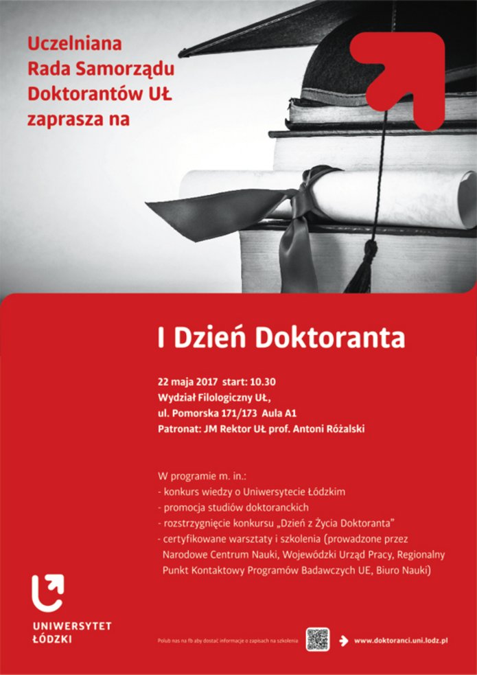 Wszystkich doktorantów oraz tych, którzy dopiero rozważają możliwość podjęcia studiów III stopnia, serdecznie zapraszamy na Pierwszy Dzień Doktoranta Uniwersytetu Łódzkiego!