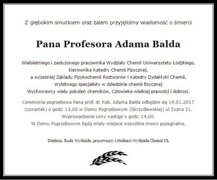 Zmarł Profesor Adam Bald, wykładowca Wydziału Chemii Uniwersytetu Łódzkiego. Nasze najszczersze kondolencje dla Rodziny i bliskich.