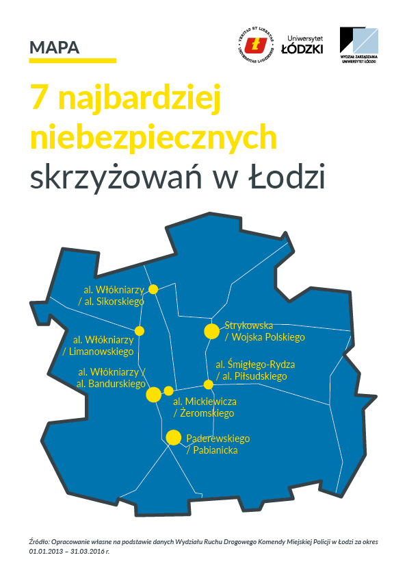 Według danych Głównego Urzędu Statystycznego, w dniu 31.12.2013 r. w Łodzi mieszkało 711 tysięcy osób. W tym samym roku zarejestrowanych było 397 tysięcy pojazdów. Miasto prowadzi szereg inwestycji drogowych, rozwija sieć ścieżek rowerowych, a w 2016 roku otwarto tu sieć roweru publicznego, z entuzjazmem przyjętą przez mieszkańców. Jednak statystyki wskazują, że w obszarze bezpieczeństwa ruchu drogowego, np. w zakresie infrastruktury drogowej, wciąż jest wiele do zrobienia. Tej kwestii postanowili przyjrzeć się naukowcy z Wydziału Zarządzania, którzy na podstawie danych dotyczących zdarzeń drogowych zgłoszonych i zarejestrowanych przez Policję w okresie 01.01.2013 - 30.06.2016 r. przygotowali raport "7 najbardziej niebezpiecznych skrzyżowań w Łodzi".