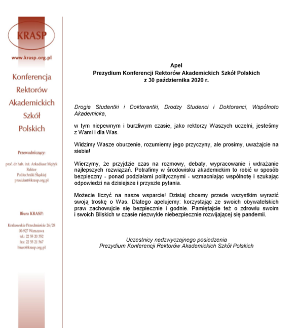 "Drogie Studentki i Doktorantki, Drodzy Studenci i Doktoranci, Wspólnoto Akademicka, w tym niepewnym i burzliwym czasie, jako rektorzy Waszych uczelni, jesteśmy z Wami i dla Was." - poniżej pełna treść apelu KRASP.