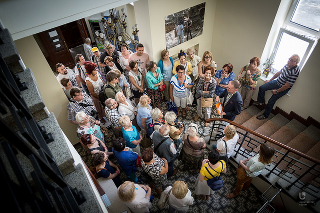 Następnym punktem spaceru była dawna siedziba Szkoły Zgromadzenia Kupców czyli obecny rektorat UŁ przy ul. Narutowicza 68. Tam zwiedzający obejrzeli m. in. reprezentacyjną klatkę schodową, będącą wizytówką pierwszego łódzkiego nowoczesnego gmachu wzniesionego na potrzeby edukacyjne na początku XX w.