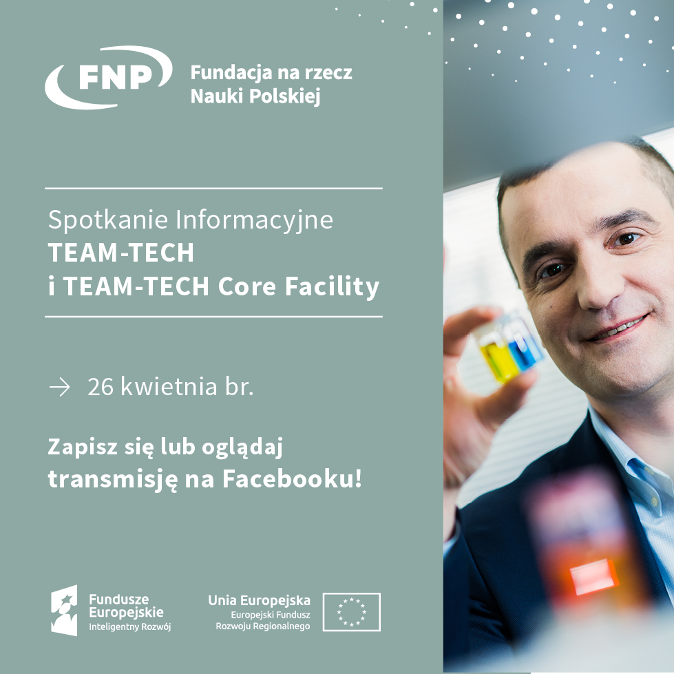 Wszystkich zainteresowanych, serdecznie zapraszamy na spotkanie informacyjne dotyczące programów TEAM-TECH oraz TEAM-TECH Core Facility i TEAM-TECH Core Facility PLUS, które odbędzie się w siedzibie Fundacji przy ul. I. Krasickiego 20/22 w Warszawie w dn. 26 kwietnia w godz. 10.00 - 13.15. Ze względu na ograniczoną liczbę miejsc, konieczna jest rejestracja poprzez formularz znajdujący się pod linkiem.