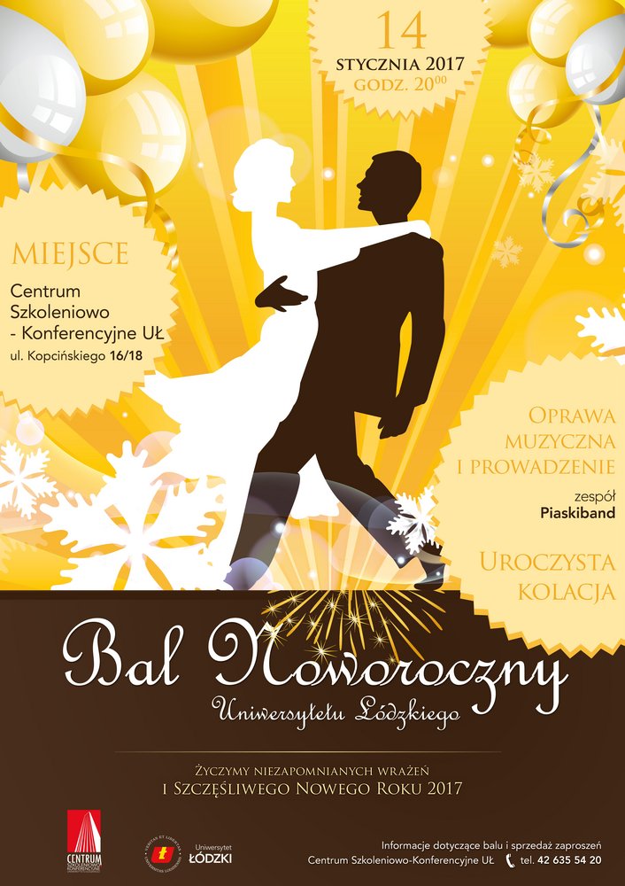JM Rektor Uniwersytetu Łódzkiego zaprasza pracowników oraz przyjaciół naszej Uczelni do wzięcia udziału w tradycyjnym, uroczystym Balu Noworocznym, który odbędzie się 14 stycznia 2017 roku o godz. 20:00 w Centrum Szkoleniowo - Konferencyjnym UŁ przy ul. Kopcińskiego 16/18. Wszelkie informacje na temat balu można uzyskać w CSK UŁ tel. 42 635 54 20.