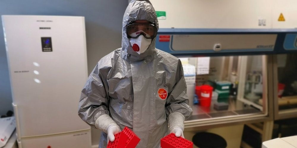 Wspierani przez innych członków Zespołu: mikrobiologów i biologów z Wydziału Biologii i Ochrony Środowiska UŁ, w tym z Biobanku UŁ, badaczy z Instytutu Biologii Medycznej Polskiej Akademii Nauk, pracowników firmy Proteon Pharmaceuticals, a nawet podchorążych Wojskowego Centrum Kształcenia Medycznego w Łodzi, którzy w tym samym czasie, przygotowują się do pracy w części laboratoryjnej i jej bezpośrednim otoczeniu.Kilkuosobowy zespół diagnostyczny, w asyście i pod nadzorem, przygotowuje się do pracy w tzw. strefie czerwonej, czyli tam gdzie istnieje możliwość bezpośredniego kontaktu z wirusem. Samo nakładanie odpowiednich warstw ochrony biologicznej - fizelinowych kombinezonów, tzw. pajacyków, kombinezonów ochronnych, gogli bądź przyłbic, masek i innych elementów pozwalających na pracę w laboratorium klasy BSL-3 - trwa niemal kwadrans.