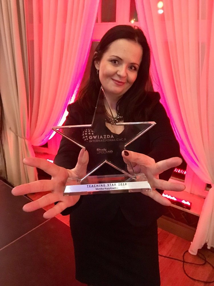 Dr Monika Kopytowska zwyciężyła w kategorii "Gwiazda Kształcenia/Teaching Star 2018". To uhonorowanie jej ogromnych zasług w rozwijaniu i ulepszaniu procesu kształcenia studentów polskich i zagranicznych w Uniwersytecie Łódzkim. Przez ostatnie 10 lat Pani Doktor opracowała nowoczesne i wydajne programy nauczania, dbała o jak największą aktywność obcokrajowców, doprowadziła do zwiększenia liczby osób z zagranicy na Wydziale Filologicznym, wspierała również programy wymiany naukowej dla studentów i pracowników naukowych. Prowadzi badania w dziedzinie dyskursu mediów, komunikacji międzykulturowej, tożsamości w kontekście religii, konfliktu oraz terroryzmu i radykalizacji.