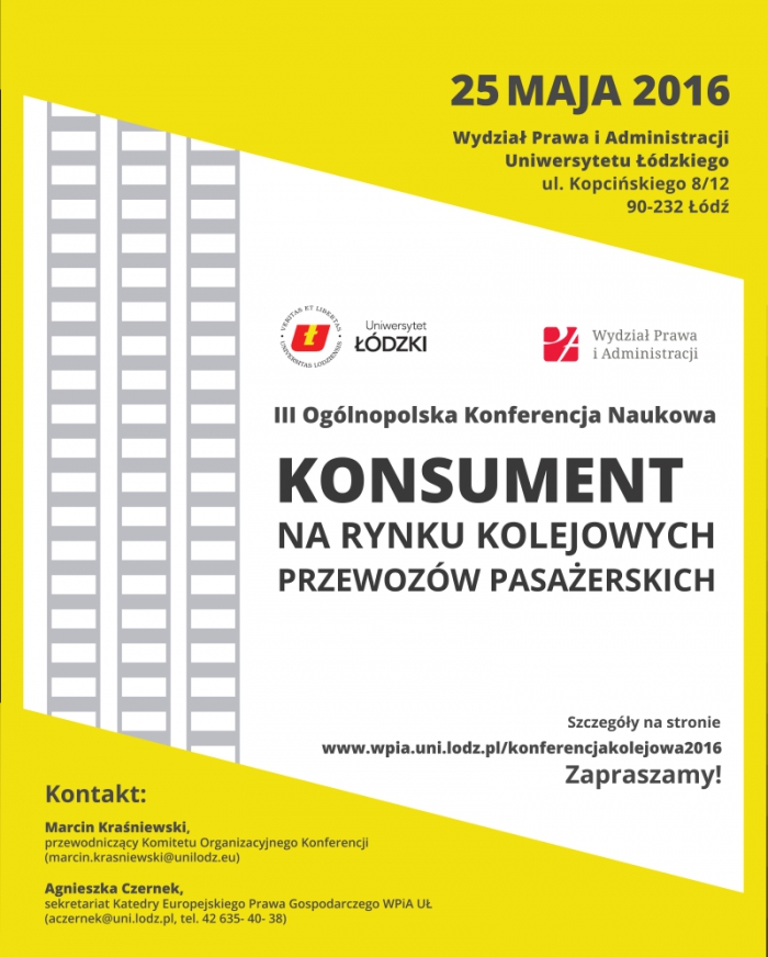 Konferencja została zorganizowana przez Katedrę Europejskiego Prawa Gospodarczego, Katedrę Prawa Gospodarczego Publicznego oraz Naukowe Koło Prawa Energetycznego i Innych Sektorów Infrastrukturalnych działające na Wydziale Prawa i Administracji Uniwersytetu Łódzkiego, Polską Fundacją Prawa Konkurencji i Regulacji Sektorowej Ius Publicum, Urząd Marszałkowski Województwa Łódzkiego przy współpracy z Urzędem Transportu Kolejowego.
