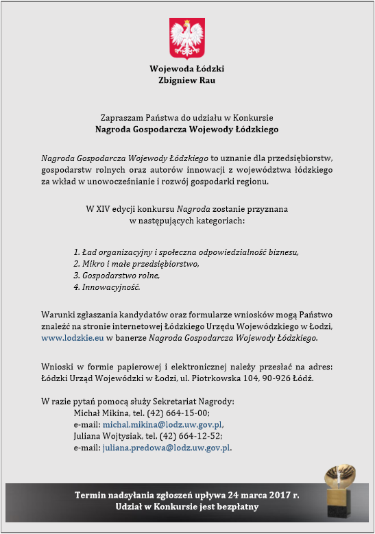 Warunki zgłaszania kandydatów oraz formularze wniosków mogą Państwo znaleźć na stronie internetowej Łódzkiego Urzędu Wojewódzkiego w Łodzi, www.lodzkie.eu w banerze Nagroda Gospodarcza Wojewody Łódzkiego.