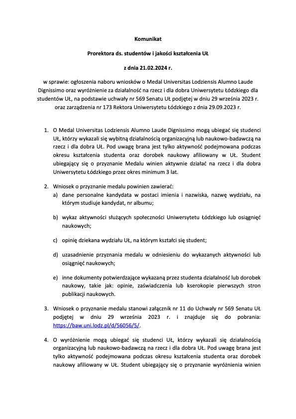 - Wniosek o przyznanie medalu dla osób studiujących stanowi załącznik nr 11 do Uchwały nr 569 Senatu UŁ podjętej w dniu 29 września 2023 roku.