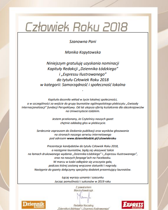Dr Monika Kopytowska otrzymała nominację w kategorii "Samorządność i społeczność lokalna" za wejście do grupy laureatów ogólnopolskiego plebiscytu "Gwiazdy Internacjonalizacji" fundacji Perspektywy i ulepszanie oferty kształcenia dla obcokrajowców na Uniwersytecie Łódzkim. W tej samej kategorii nominowany został dr. hab. Marcin Gołaszewski za wysoki (10 858 głosów) wynik w wyborach do Rady Miejskiej w Łodzi i objęcie stanowiska przewodniczącego rady, choć w wyborach był debiutantem. W kategorii "Kultura" kapituła wyróżniła podróżnika i doktoranta UŁ Tomasza Grzywaczewskiego za książkę "Granicę marzeń. O państwach nieuznawanych" i inspirujące wyprawy. W kategorii "Działalność społeczna i charytatywna" nominowany został Michał Pietrakiewicz za aktywność w akcji Szlachetna Paczka oraz prowadzenie Akademii Przyszłości w woj. łódzkim.