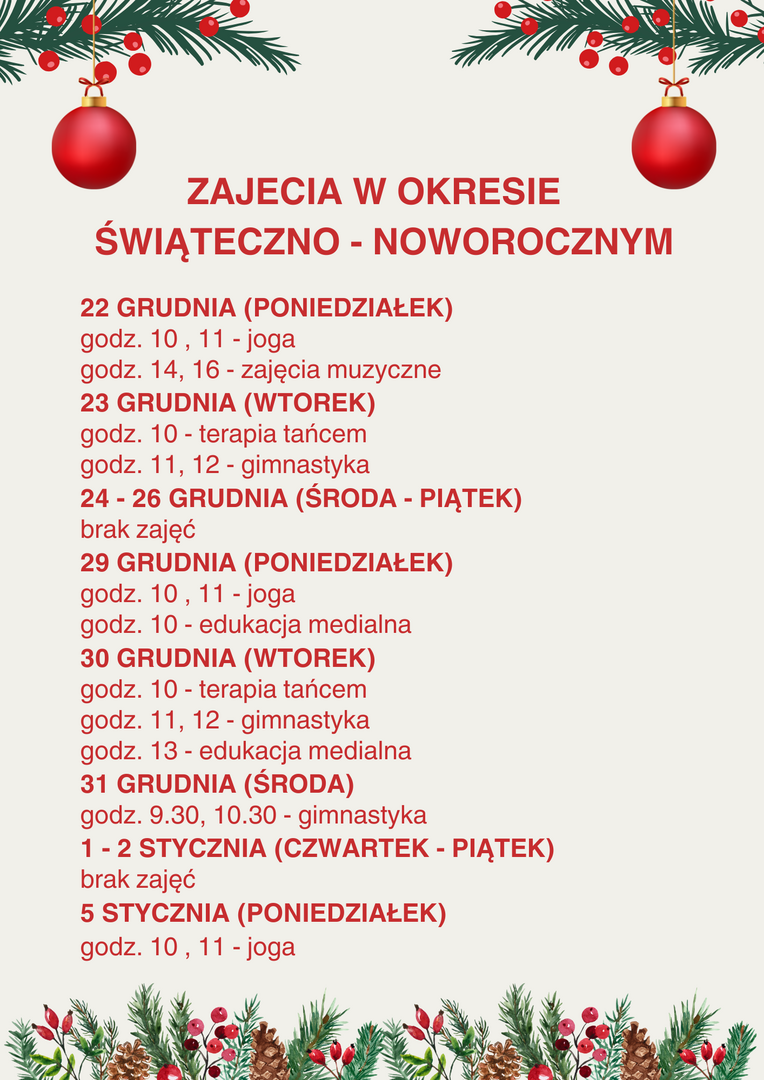 Prosimy o zapoznanie się z częściowo zmienionym rozkładem zajęć w okresie świątecznym oraz na przełomie roku.