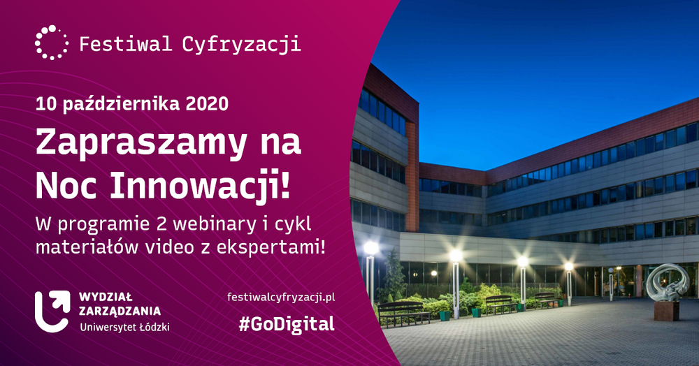 W ubiegłym roku Wydział Zarządzania UŁ jako jedyny reprezentował łódzkie środowisko akademickie na Festiwalu Cyfryzacji. Tym razem formuła spotkań przenosi się do wirtualnej przestrzeni. Udział w wydarzeniach jest BEZPŁATNY! W tym roku zapraszamy na dwa webinary i cykl materiałów video z ekspertami: