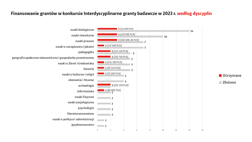 nauki o polityce i administracji – grantów złożonych 1, grantów otrzymanych 1, łączna otrzymana kwota to: 20 000 zł;