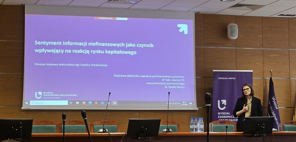 W dniu 17 kwietnia 2024 roku na Wydziale Ekonomiczno-Socjologicznym miała miejsce publiczna obrona pracy doktorskiej naszej koleżanki z Katedry - mgr Eweliny Niedzielskiej pt. Sentyment informacji niefinansowych jako czynnik wpływający na reakcję rynku kapitałowego.