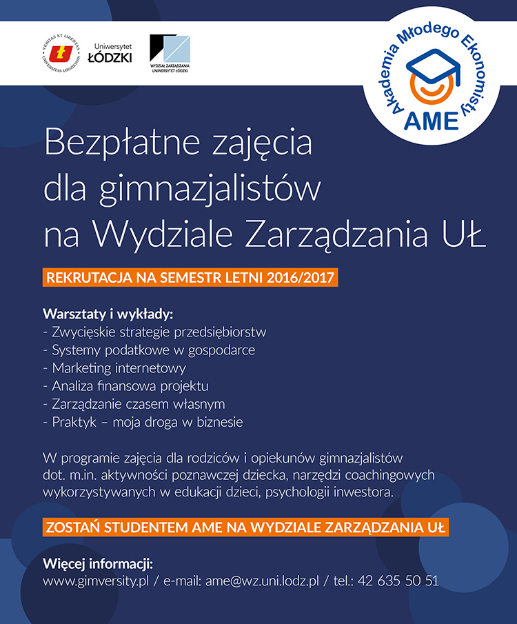 Zadaniem AME jest popularyzacja przedsiębiorczości i zagadnień ekonomicznych wśród młodzieży oraz kształtowanie proaktywnej postawy. Zajęcia są prowadzone m.in. w Szkole Głównej Handlowej w Warszawie, na Uniwersytecie Ekonomicznym w Poznaniu czy Uniwersytecie Ekonomicznym w Katowicach. Po raz czwarty będzie można uczestniczyć w AME również w Łodzi, na Wydziale Zarządzania UŁ.