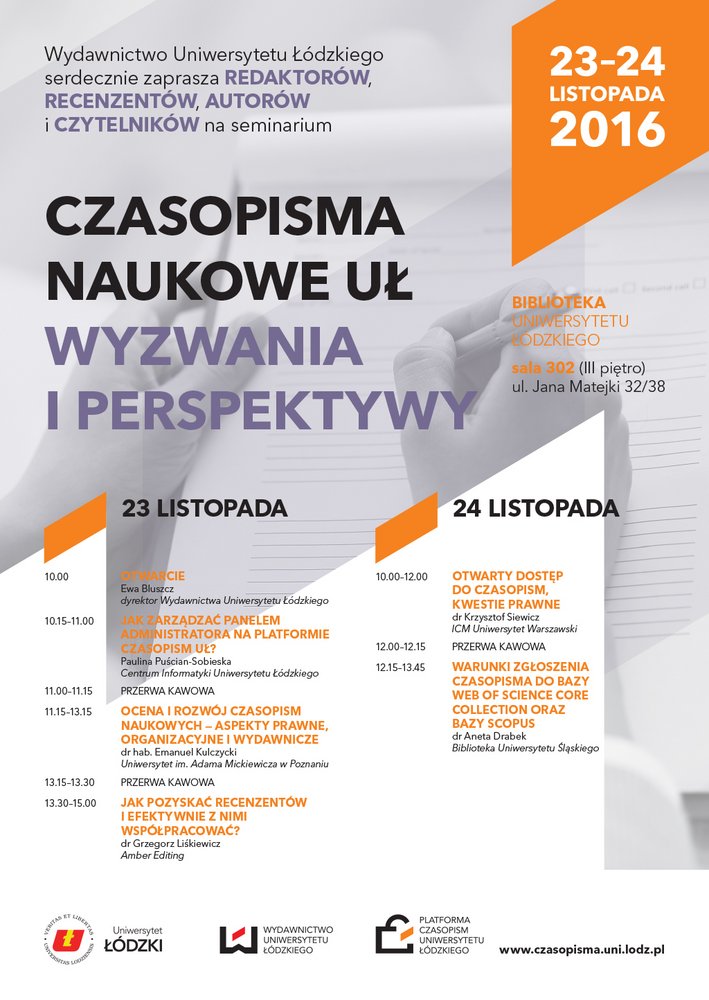 Wydawnictwo Uniwersytetu Łódzkiego serdecznie zaprasza redaktorów, autorów i czytelników na seminarium, które odbędzie się 23 i 24 listopada 2016 r. w Bibliotece UŁ.