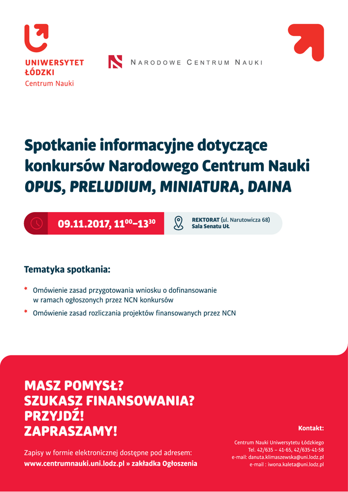 Zapraszamy wszystkich zainteresowanych na spotkanie informacyjne dotyczące konkursów Narodowego Centrum Nauki: OPUS, PRELUDIUM, MINIATURA, DAINA, które organizowane jest w dniu 9 listopada 2017 r. o godzinie 11:00 w Sali Senatu mieszczącej się w Rektoracie (ul. Narutowicza 68).