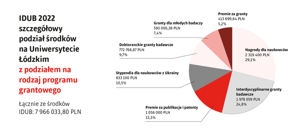 Plansza przedstawia wykres kołowy zatytułowany: IDUB 2022 szczegółowy podział środków na Uniwersytecie Łódzkim z podziałem na rodzaj programu grantowego. Wykres kołowy na planszy obrazuje podział środków na: Interdyscyplinarne granty badawcze: 1 978 059 zł 24,8%; Granty dla młodych badaczy: 593 006,38 zł 7,4%; Doktoranckie granty badawcze: 772 768,87 zł 9,7%; Premie za granty: 413 699,64 zł 5,2%; Stypendia dla naukowców z Ukrainy: 833 100 zł 10,5%; Premie za publikacje i patenty: 1 056 000 zł 13,3%; Nagrody dla naukowców: 2 319 400 zł 29,1%; Łącznie ze środków IDUB: 7 966 033,8 zł.