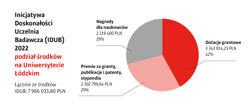 Plansza przedstawia wykres kołowy zatytułowany: Inicjatywa Doskonałości Uczelnia Badawcza (IDUB) 2022 podział środków na Uniwersytecie Łódzkim. Wykres kołowy na planszy obrazuje podział środków na: dotacje grantowe: 3 343 834,25 zł (42%); premie za granty, publikacje i patenty, stypendia: 2 302 799,64 zł (29%) oraz nagrody dla naukowców: 2 319 400 zł (29%). Łącznie ze środków IDUB: 7 966 033,8 zł.