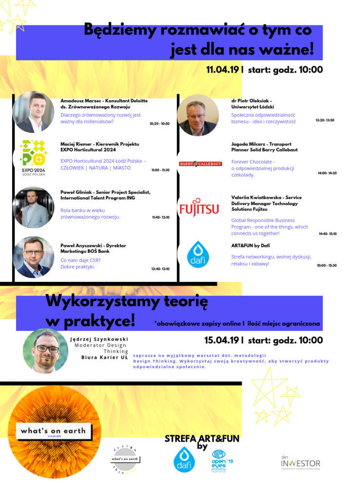 Festiwal Myśli Zrównoważonej "What's on Earth" - to spotkanie przedstawicieli polskiego biznesu z ambitnymi studentami polskich uczelni. Celem projektu jest pokazanie roli CSRu w rozwoju gospodarki, ekonomii, a także odpowiedzialnego społeczeństwa. Festiwal Myśli Zrównoważonych ma być przestrzenią wolnego wyrażania swojego zdania, konfrontacji wielu punktów widzenia oraz impulsem, który zachęci do poruszania tematów dotyczących odpowiedzialnego biznesu, także w środowisku akademickim. Chcemy, by przekazywana wiedza była atrakcyjna a jednocześnie łatwa do rozumienia i przyswojenia. Pragniemy inspirować - edukując. Odpowiedzialne prowadzenie biznesu ma w naszych oczach realny wpływ na funkcjonowanie oraz poglądy współczesnego społeczeństwa. Dzięki stworzeniu przestrzeni do dyskusji w środowisku akademickim o faktycznych działaniach - zarówno największych, jak i lokalnych przedsiębiorców, chcemy zwiększyć świadomość naszych rówieśników o aktywnościach podejmowanych w globalnej perspektywie. Całe wydarzenie ma być podzielone na dwie przestrzenie - scenę wykładowczą, na której zaproszeni goście będą mieli okazję zaprezentować swoje prezentacje oraz wziąć udział w panelach dyskusyjnych, a także przestrzeń otwartą.