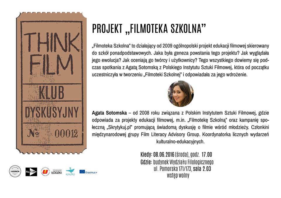 "Filmoteka Szkolna" to działający od 2009 roku ogólnopolski projekt edukacji filmowej skierowany do szkół ponadpodstawowych. Na spotkaniu będzie można dowiedzieć się jaka była geneza powstania "Filmoteki Szkolnej" oraz jak wyglądała jej ewolucja. Jak oceniają projekt dziś twórcy i użytkownicy? Spotkanie poprowadzi Agata Sotomska z Polskiego Instytutu Sztuki Filmowej, która uczestniczyła w tworzeniu "Filmoteki Szkolnej" od samego początku i odpowiadała za wdrożenie projektu.