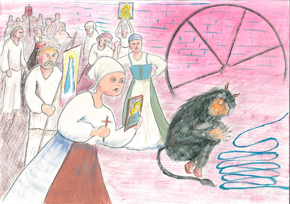 W rozprawieniu się z diabłem - Scheiblerem miały im pomóc kościelne chorągwie, święte obrazy, krucyfiksy i pobożne pieśni. Mężczyźni wdarli się do fabryki i przy pomocy łomów, kijów i kamieni zaczęli rozbijać piekielną maszynę, czyli maszynę parową. W pewnym momencie z uszkodzonego zawora kotła zaczęła wydobywać się para, sycząc pod wpływem wysokiego ciśnienia oraz lać się gorąca woda. Robotnicy odczytali to jako ingerencję diabła, który w ten sposób chciał ocalić fabrykę Scheiblera.