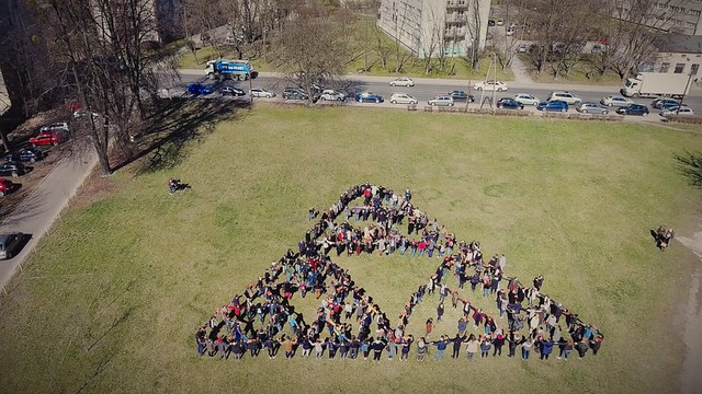 W każdym z nich powtarzamy procedurę usuwania "środkowych trójkątów". W otrzymanych 9 trójkątach ponownie usuwamy "środkowe trójkąty" itd. W granicy otrzymujemy trójkąt Sierpińskiego. Żywy trójkąt Sierpińskiego utworzyło 243 (czyli 3 do potęgi 5) uczniów Publicznego Liceum Ogólnokształcącego Uniwersytetu Łódzkiego, rozpoczynając od trójkąta równobocznego o boku 24 metry, uzyskując piąte przybliżenie, a trzymanymi nad głowami kartkami imitując przybliżenie dziewiąte.