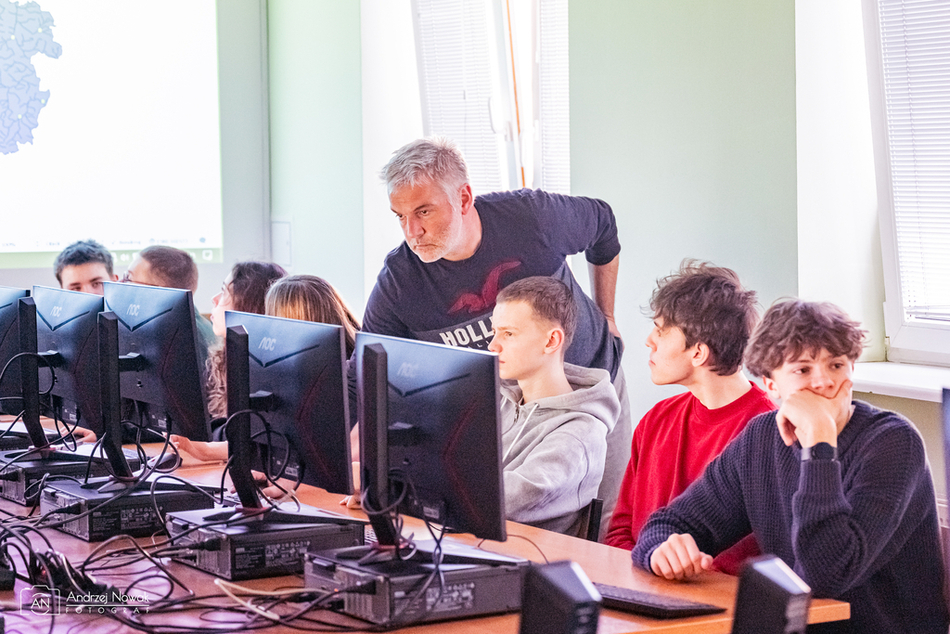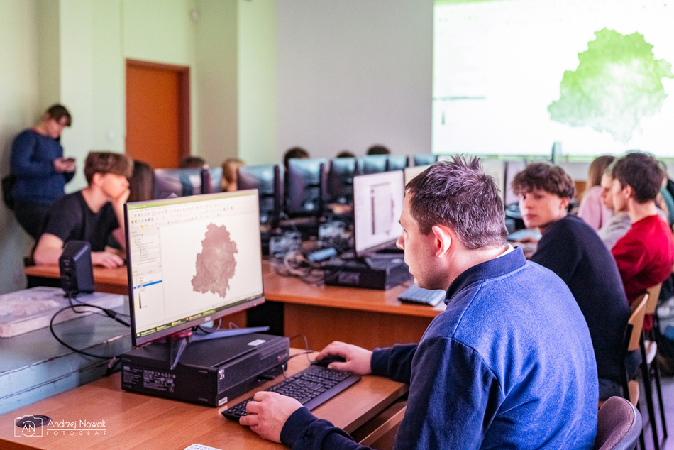 Dr Marcin Jaskulski i dr Łukasz Lechowski zaczęli zajęcia od omówienia pojęcia geoinformacji oraz jej praktycznych zastosowań. Przedstawili młodzieży możliwości rozwijania własnych zainteresowań w ramach studiowania różnych kierunków na Wydziale Nauk Geograficznych.