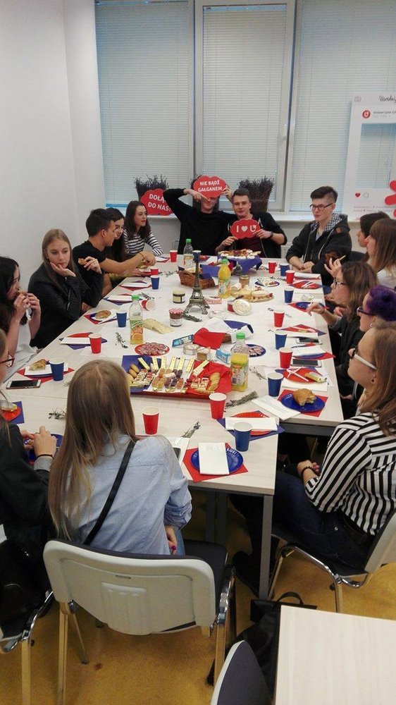 Wcześniej prorektor ds. studenckich dr. hab. prof. nadzw. UŁ Tomasz Cieślak przedstawił obecnym uczniom wiele cennych informacji na temat możliwości oferowanych przez naszą uczelnię w ramach programu "Zdolny uczeń, świetny student". Później maturzyści trafili pod skrzydła studentów, którzy przybliżyli im kulisy warsztatu radiowego, informacje na temat muzyki i języka francuskiego oraz przeprowadzili ćwiczenia aktorskie i teatralne. Zwieńczeniem dnia był poczęstunek w iście francuskim stylu - na stole pojawiły się sery, kiełbaski, bagietki, croissanty, krem z kasztanów, foie gras i dużo słodkości.