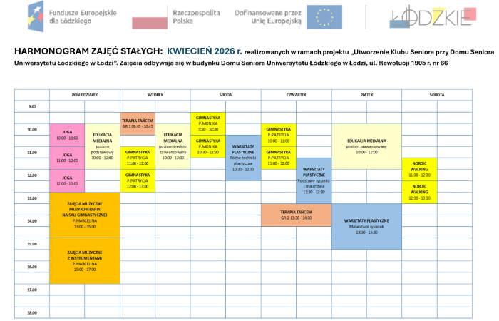 Zajęcia taneczne, realizowane są w Domu Seniora UŁ w ramach projektu "Utworzenie Klubu Seniora przy Domu Seniora Uniwersytetu Łódzkiego w Łodzi", dofinansowanego przez Unię Europejską ze środków Programu "Fundusze europejskie dla Łódzkiego 2021 - 2027"