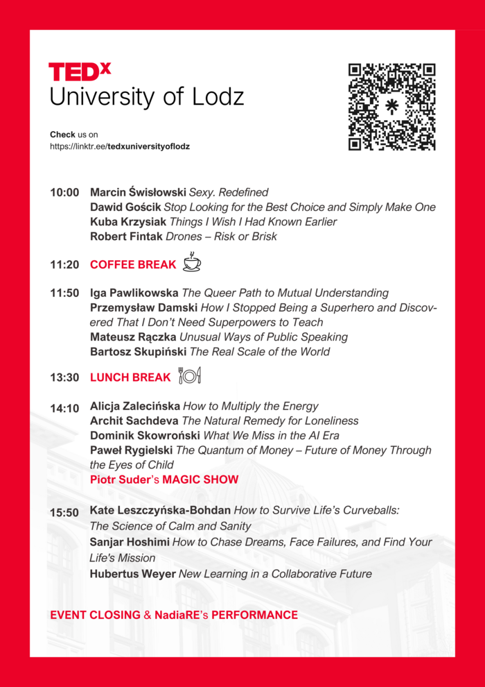 If you are interested in collaboration, have a question for us, or have an idea for a talk, we warmly invite you to get in touch. Together, we can create this event! mail: tedxuniversityoflodz@gmail.com