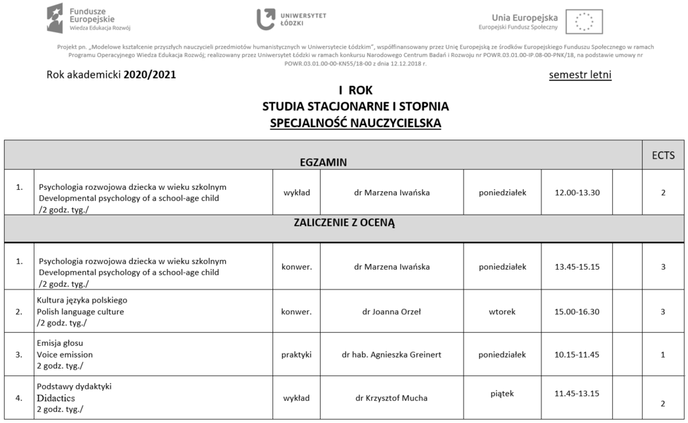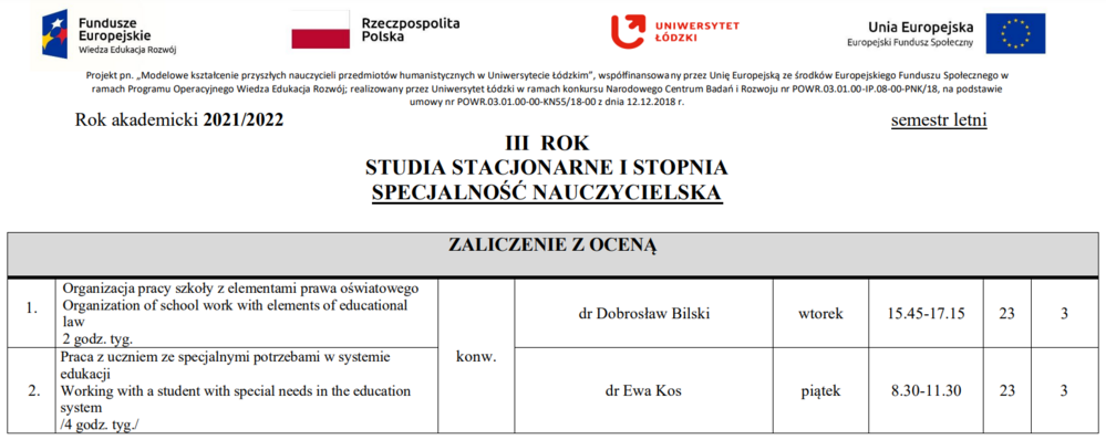 Plan zajęć – semestr letni 2021/2022