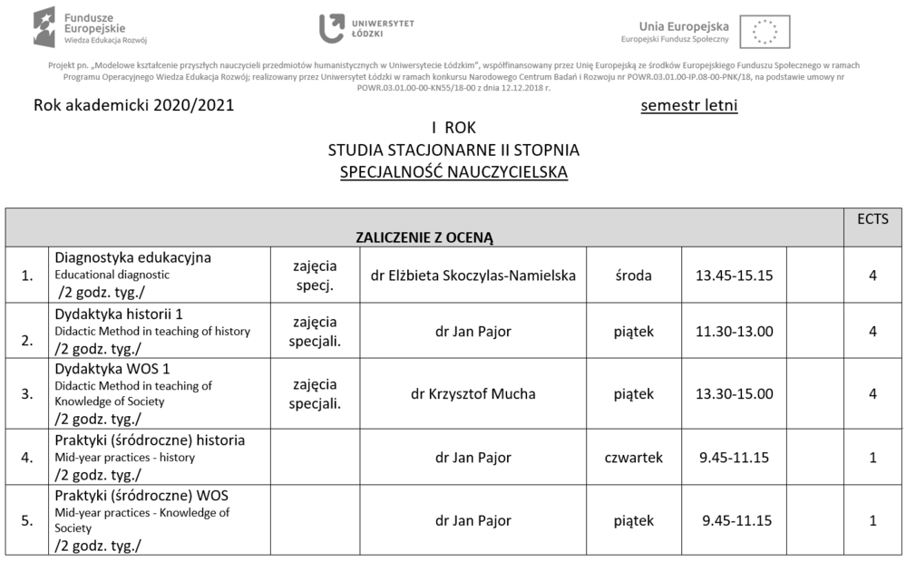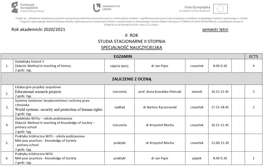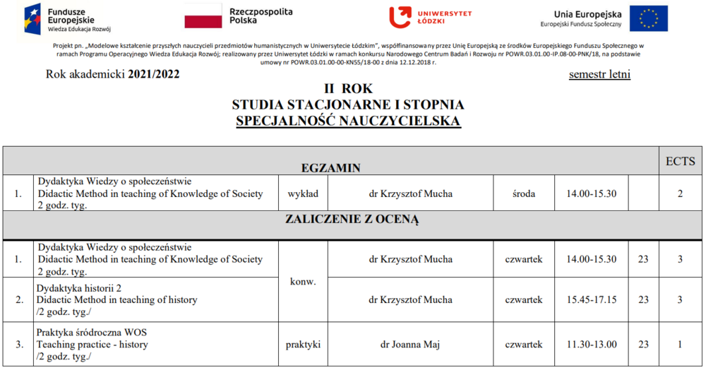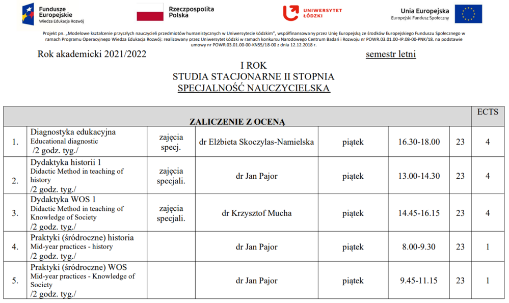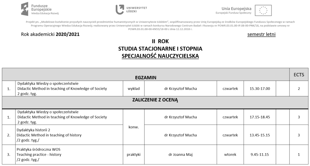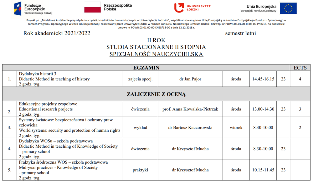 OPRACOWANIE PROGRAMÓW KSZTAŁCENIA NAUCZYCIELI NA I I II STOPNIU STUDIÓW, kierunek HISTORIA na Wydziale Filozoficzno-Historycznym UŁ, nauczanie Historii i Wiedzy o społeczeństwie