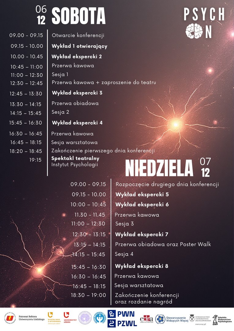 Studenckie Koło Psychologii Klinicznej i Neuropsychologii wraz z Zakładem Psychologii Klinicznej i Psychopatologii Instytutu Psychologii Uniwersytetu Łódzkiego ma przyjemność zaprosić na kolejną, dziesiątą edycję Ogólnopolskiej Konferencji Studentów i Młodych Naukowców „Psych-On”, która odbędzie się 6-7 grudnia 2024r. w Instytucie Psychologii Uniwersytetu Łódzkiego.