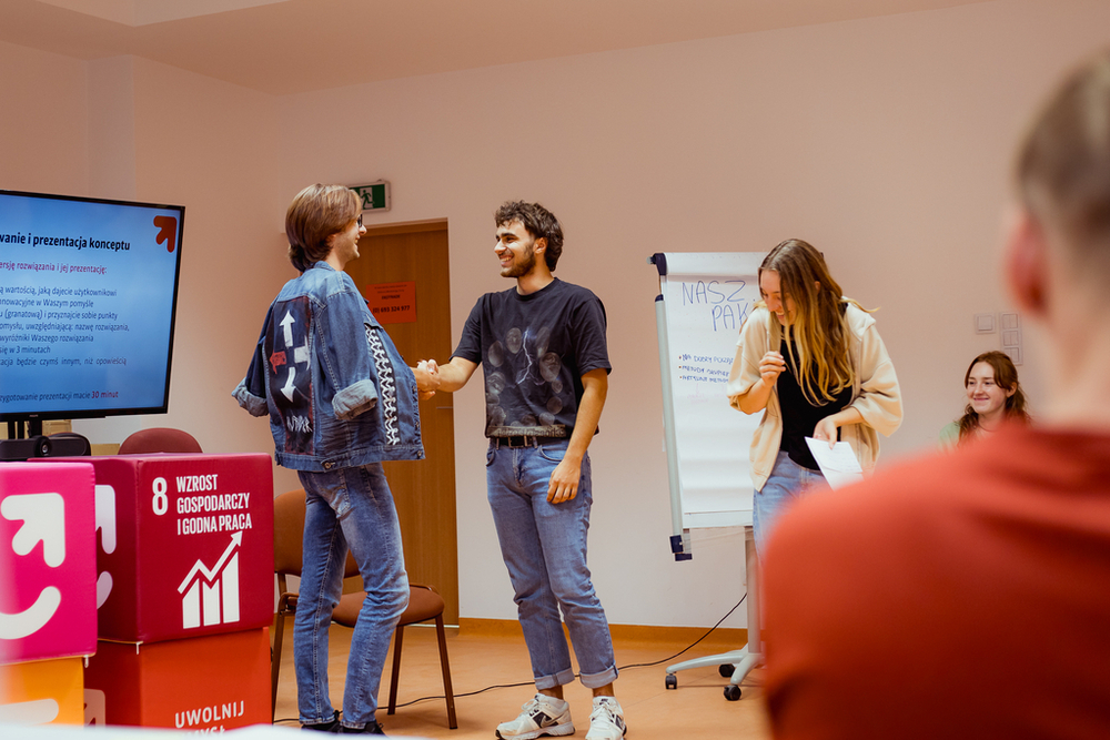 Elementem drugiego dnia kursu była mini-rywalizacja. Projektowanie rozwiązań przyjęło rolę konkursu, w którym o wygranej decydowały osoby, uczestniczące w Przystanku Pomysł. Każda z grup przyznawała punkty, biorąc pod uwagę: innowacyjność pomysłu, trafność przedstawionej propozycji (na ile odpowiada na określony problem), realne szanse na jego wdrożenie oraz jakość prezentacji.
