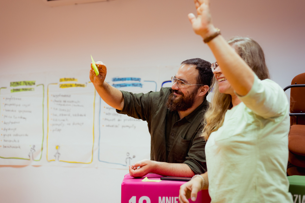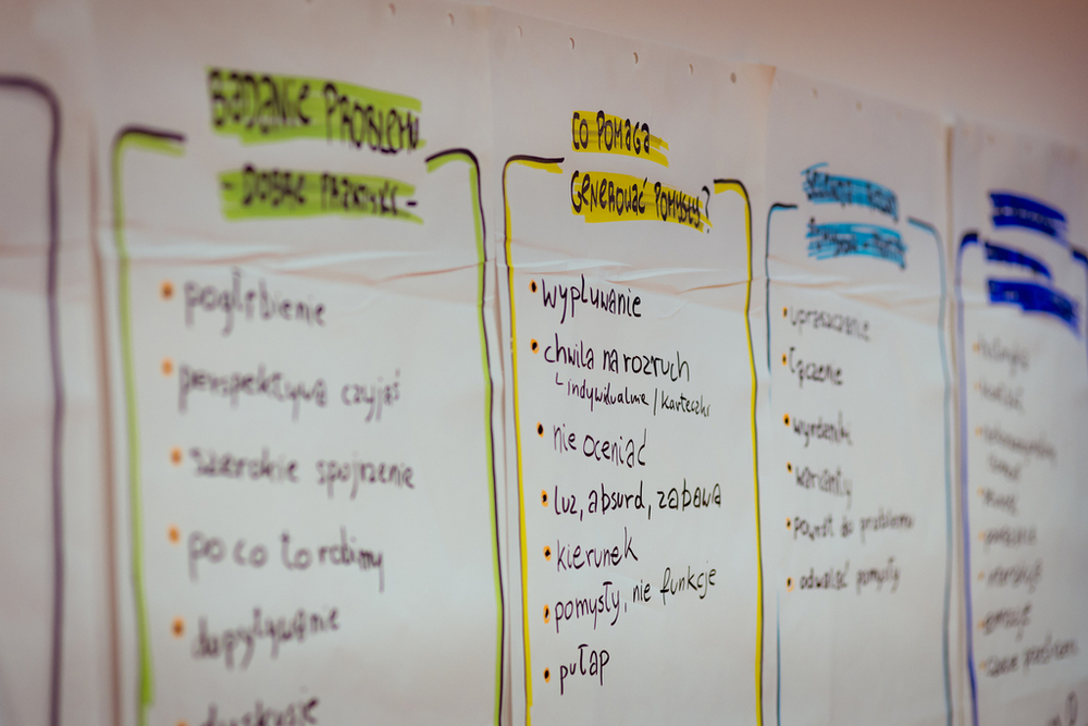 Podczas dwóch dni wspólnej pracy testowaliśmy narzędzia i techniki, które ułatwiają analizę problemu, a także generowanie oraz selekcję i rozwijanie pomysłów.