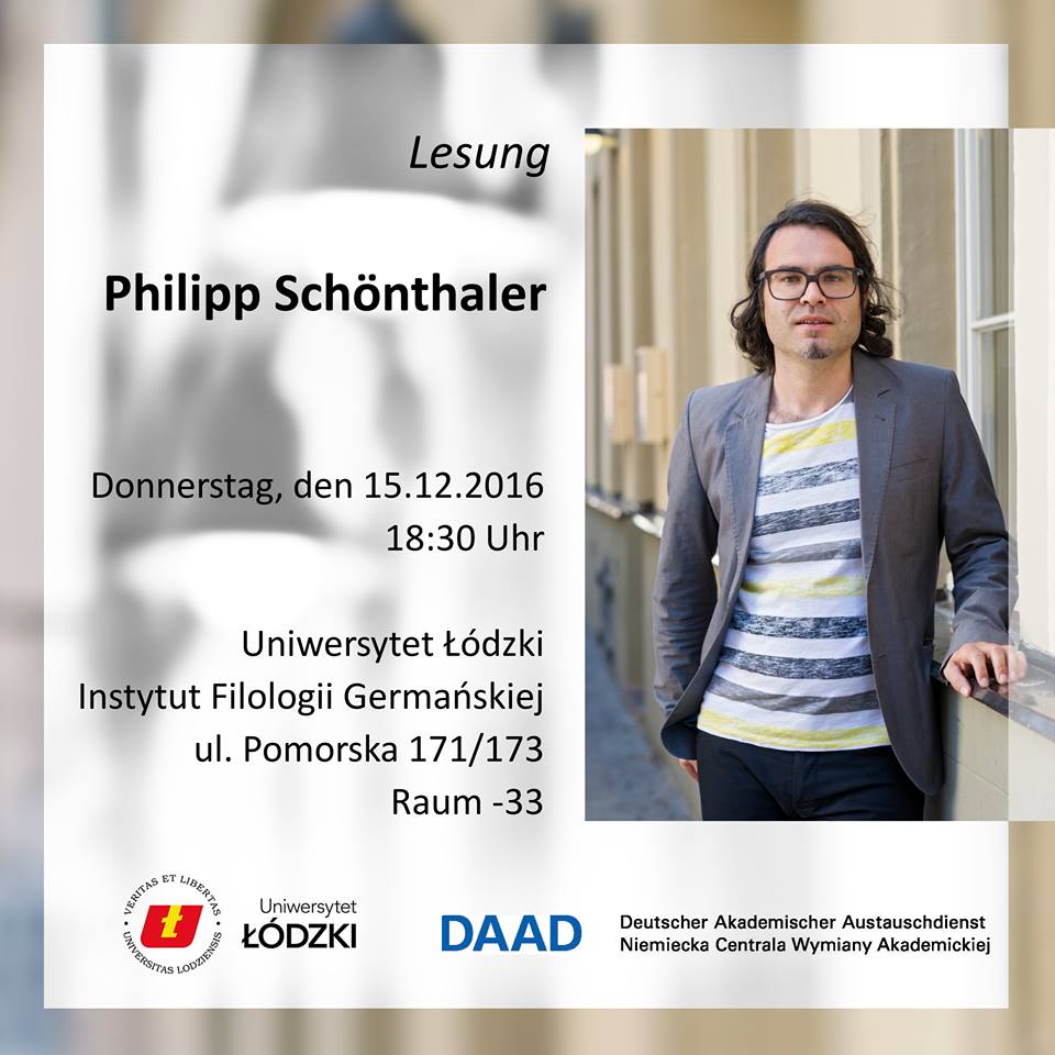 Instytut Filologii Germańskiej UŁ serdecznie zaprasza na spotkanie z niemieckim pisarzem Philippem Schönthalerem, które odbędzie się 15 grudnia o godz. 18:30 w sali -33 budynku Wydziału Filologicznego UŁ (ul. Pomorska 171/173).