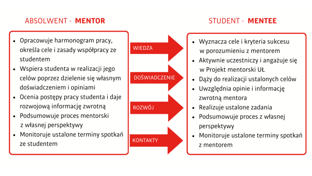 Współpraca z mentorem lub mentorką polega na regularnych spotkaniach, podczas których student lub studentka korzysta z wiedzy i doświadczenia praktyka. Mentor wspiera w planowaniu ścieżki kariery, pomaga spojrzeć szerzej na możliwości zawodowe, dzieli się doświadczeniami i inspiruje do działania. To przestrzeń do zadawania pytań, rozwiewania wątpliwości i zdobywania cennych wskazówek.