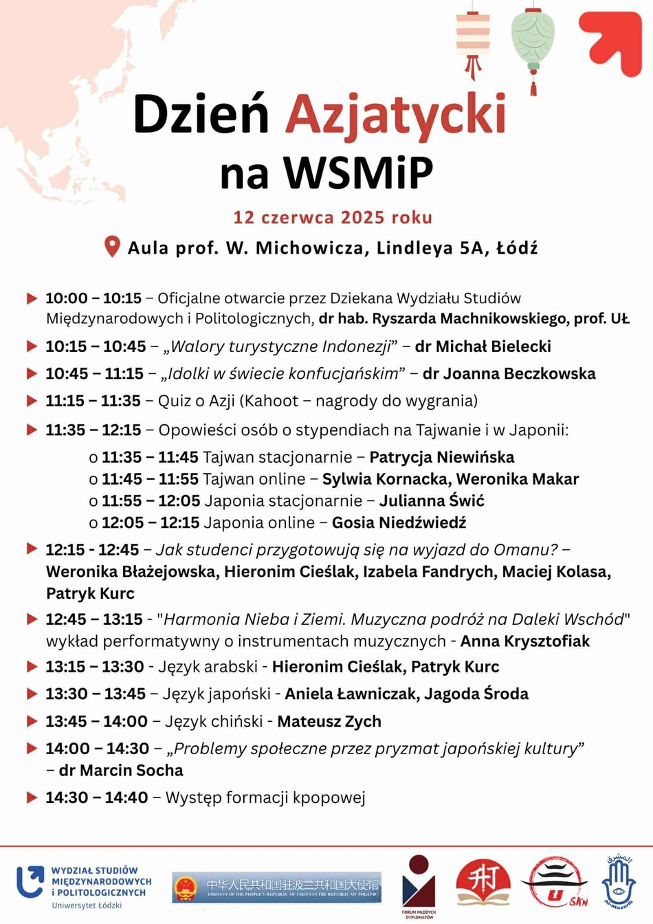 Na gości czeka masa atrakcji — m. in. wystąpienia kadry akademickiej naszego wydziału, którzy zaprezentują ciekawe wykłady o tematyce azjatyckiej oraz przedstawienia studentów kierunków studia azjatyckie, którzy opowiedzą o wyjazdach zagranicznych do Japonii czy Tajwanu możliwych podczas studiów, jak również o językach, których mamy szansę się tutaj uczyć! Na sam koniec, czeka na państwa świetny występ taneczny formacji k-popowej! Nie może was tutaj zabraknąć!