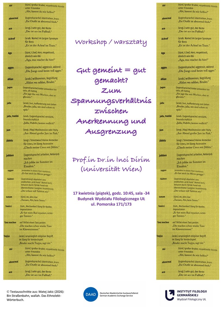 Obydwa wydarzenia odbędzie się stacjonarnie w sali 34 (poziom -1). Organizatorami są Instytut Filologii Germańskiej oraz Niemiecka Centrala Wymiany Akademickiej.