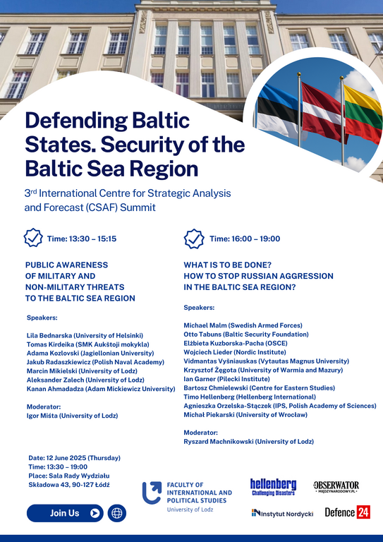 13:30-15:15 Pierwsza studencko-doktorancka sesja panelowa: „Świadomość zagrożeń militarnych i niemilitarnych dla bezpieczeństwa państw nadbałtyckich".