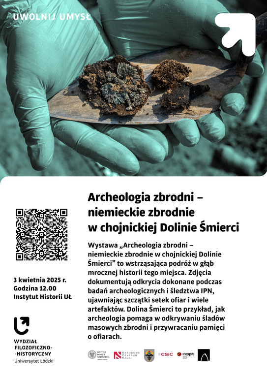 W czwartek 3 kwietnia 2025 roku o godzinie 12:00 odbędzie się wernisaż wystawy „Archeologia zbrodni – niemieckie zbrodnie w chojnickiej Dolinie Śmierci”. Ta wyjątkowa wystawa zaprezentuje wyniki prac terenowych, w ramach których naukowcy z Instytutu Archeologii UŁ oraz prokuratorzy z Pionu Śledczego IPN w Gdańsku odnaleźli szczątki około 700 Polaków zamordowanych pod Chojnicami – jesienią 1939 roku i pod koniec stycznia 1945 roku.