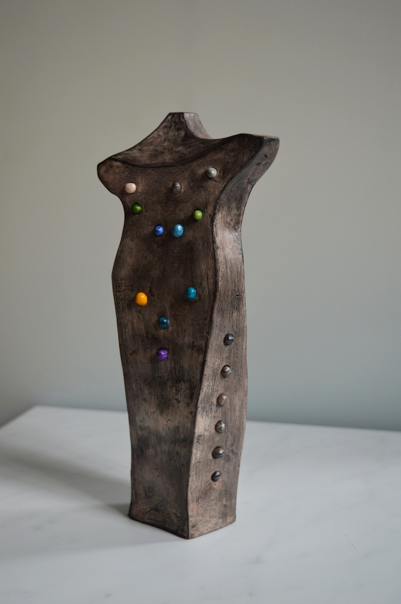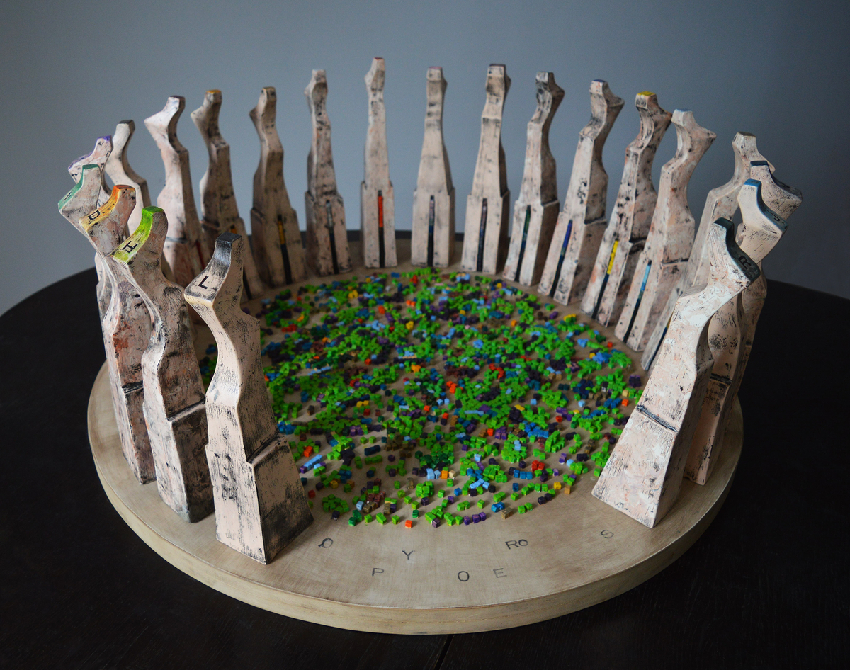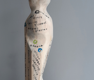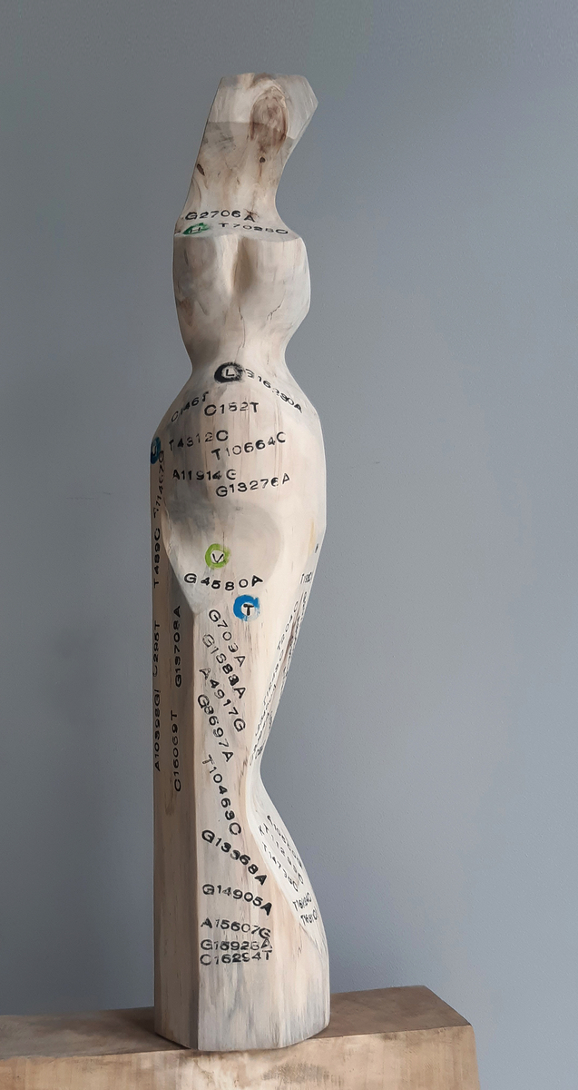 W 2019 roku Biobank Łódź, który zajmuje się zagadnieniami biologii molekularnej i genetyki, przeprowadził badania mitochondrialnego DNA populacji ludzkiej na terenie Polski. Można było się dowiedzieć między innymi, z jakiej linii genetycznej – z jakiej grupy pierwszych mieszkańców Europy – się wywodzimy. Ten rodzaj DNA jest prawie wyłącznie przekazywany przez kobiety – z matki na córki. Najważniejsza z prac wystawy, która bezpośrednio czerpie z badań Biobanku, złożona jest z figur pramatek w liczbie odpowiadającej rodzinom haplogrup, jakie ujawniły się na terenie Polski. Posiadają one taką samą sylwetkę, a wyznacznikiem każdej rodziny jest litera i kolor. Kolory, które w mieszaninie kostek rozrzuconych między figurami pramatek odzwierciedlają złożoność i proporcje występowania reprezentantów każdej z grup na terenie Polski. Pramatki są ustawione w kręgu, bo koło jest figurą, w którą układa się mitochondrialne DNA. Wśród pozostałych rzeźb można odnaleźć pramatkę, symboliczną kobietę, od której wywodzi się każdy z nas.