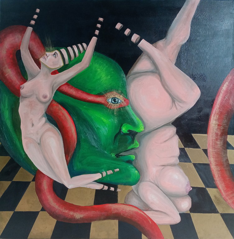 Alicja Dudzińska, Patos kompleksu pierwotnego, akryl i olej na płótnie, 1m x1m (2024)